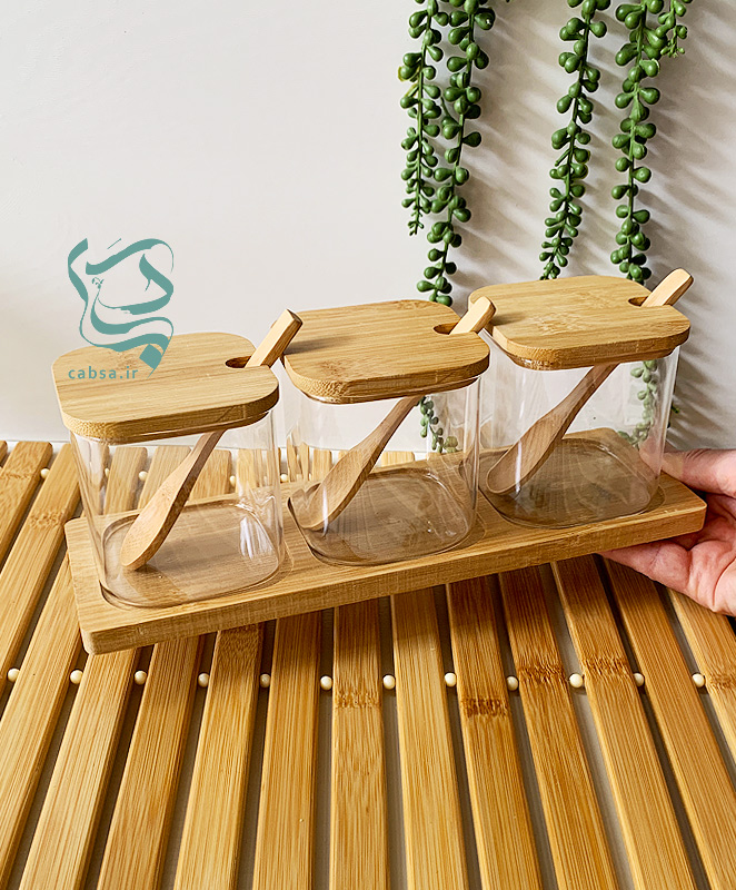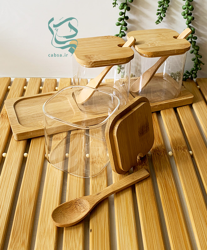 بانکه پیرکس مربع قطر 8 سانت قاشق دار درب بامبو ست 3 تایی - ست جا ادویه